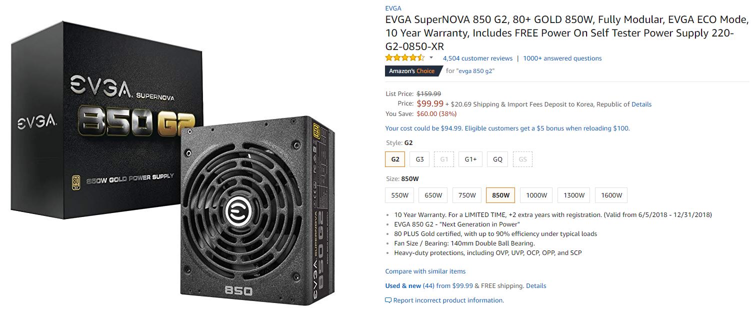 에브가 슈퍼노바 (EVGA SuperNOVA 850 G2, 80+ GOLD 850W) 아마존 무료배송