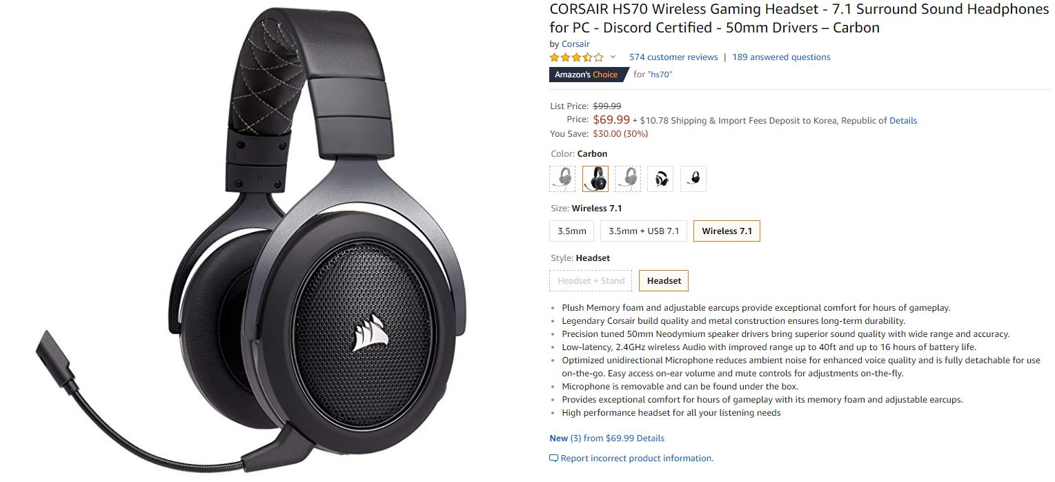 [해외직구] 오버워치, 베틀그라운드용 무선 게이밍 헤드셋 가격비교 – 커세어 HS70 헤드폰